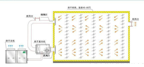 3.循環(huán)風(fēng)系統(tǒng):將熱量帶到烘干房的每個(gè)角落提升烘干房的溫度,并將物料蒸發(fā)出來(lái)的水分帶走。